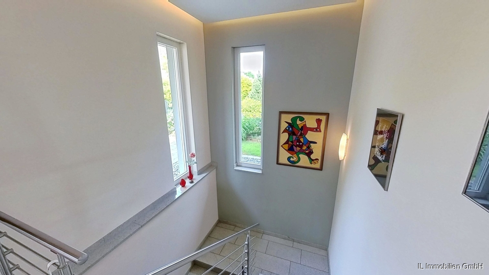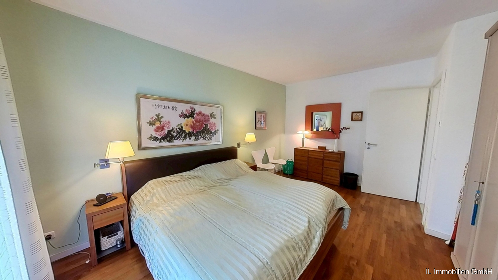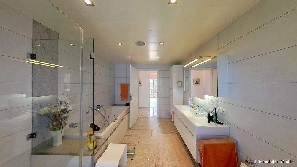 Im Erdgeschoss erwartet Sie ein großzügiges Wohnambiente: das weitläufige Wohnzimmer mit Kamin und angeschlossener Bibliothek lädt zum Verweilen ein und bietet von beiden Bereichen aus direkten Zugang zur einladenden Terrasse aus Granit, die mit einem Glatz-Sonnenschirm und integrierten Lautsprechern ausgestattet ist - ideal für entspannte Stunden im Freien. Die exklusive Küche ist mit erstklassigen Miele-Geräten, darunter ein Dampfgarer und ein Induktionsherd sowie einem AEG-Tiefkühlschrank ausgestattet und stellt auch ambitionierte Kochprofis zufrieden. Das Schlafzimmer bietet neben hohem Komfort auch Anschluss an das zentrale Audiosystem, das zusätzlich in Küche, Bad, Terrasse und Sauna für eine angenehme Klangkulisse sorgt. Das geräumige Badezimmer verfügt über eine große Dusche und eine Whirlpool-Badewanne. Im gesamten Wohnbereich ist hochwertiges Parkett verlegt, während Bäder, Flure und das Treppenhaus mit edlem Granit ausgestattet sind.