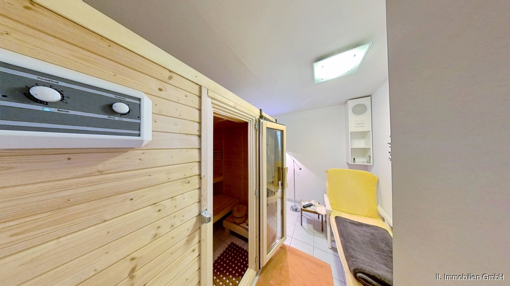 Im Untergeschoss (als Nutzfläche deklariert) stehen 3 weitere wohnlich ausgebaute Räume zur Verfügung, die sich als Büro, Gästezimmer oder Hobbyräume nutzen lassen. Auch hier wurde auf Komfort nicht verzichtet: eine Sauna, ein weiteres Badezimmer mit Dusche, ein Wasch- und Trockenraum, ein Vorratsraum sowie der Hausanschlussraum bieten reichlich Platz.
