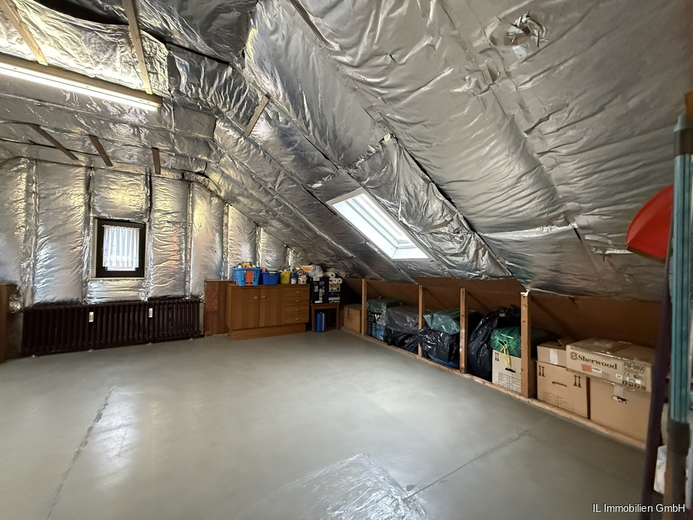 Der große Spitzboden ist bereits vorbereitet mit Dämmung, Fenster und Rigips-Verkleidung und kann mit wenigen Handgriffen zu Wohnzwecken gestaltet werden.