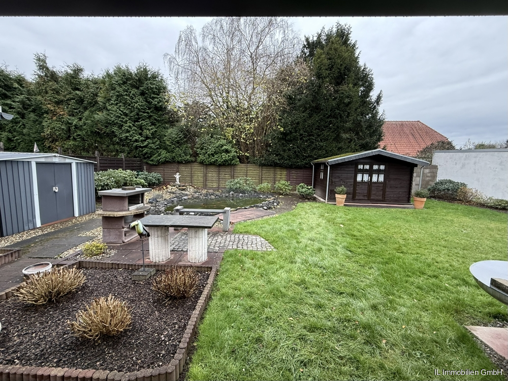 - Garten mit Gartenhaus, Gerätehaus und Teich