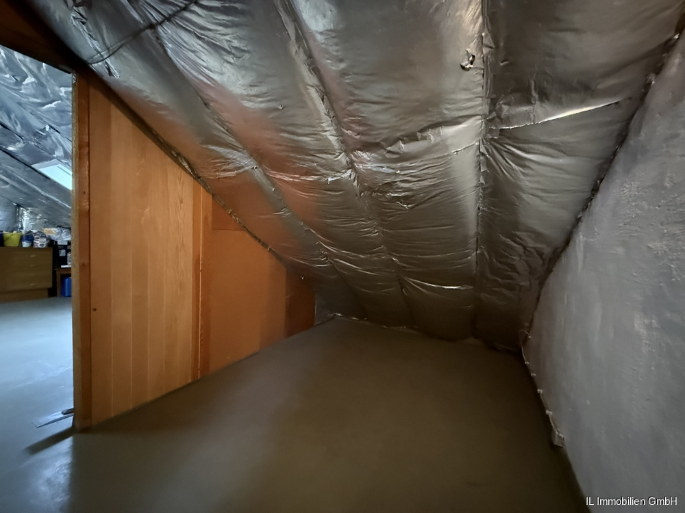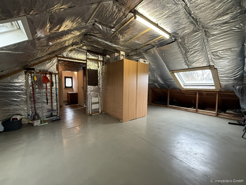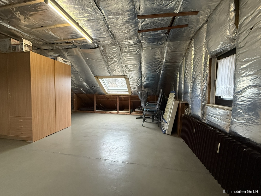Der große Spitzboden ist bereits vorbereitet mit Dämmung, Fenster und Rigips-Verkleidung und kann mit wenigen Handgriffen zu Wohnzwecken gestaltet werden.