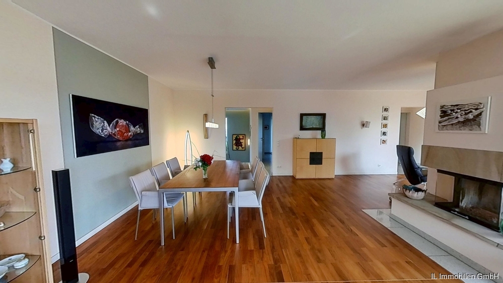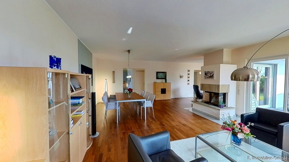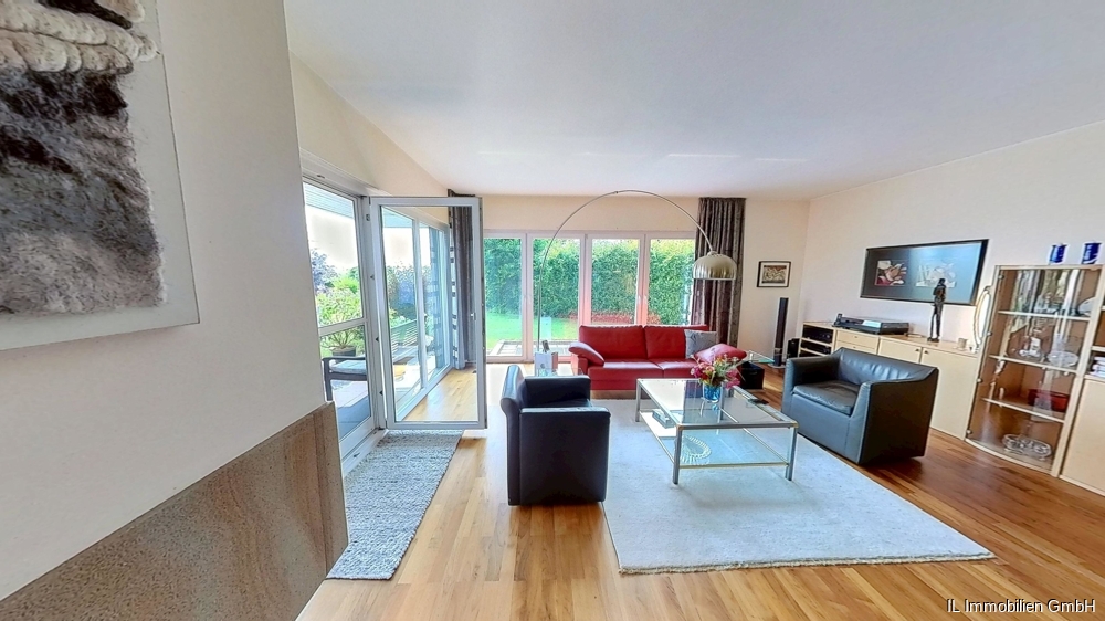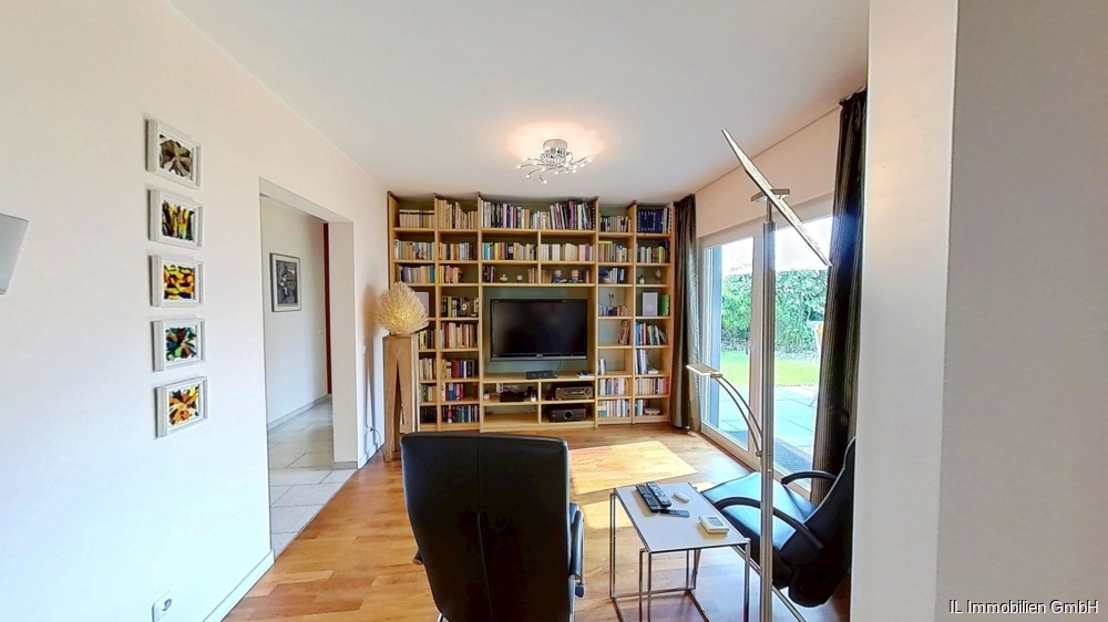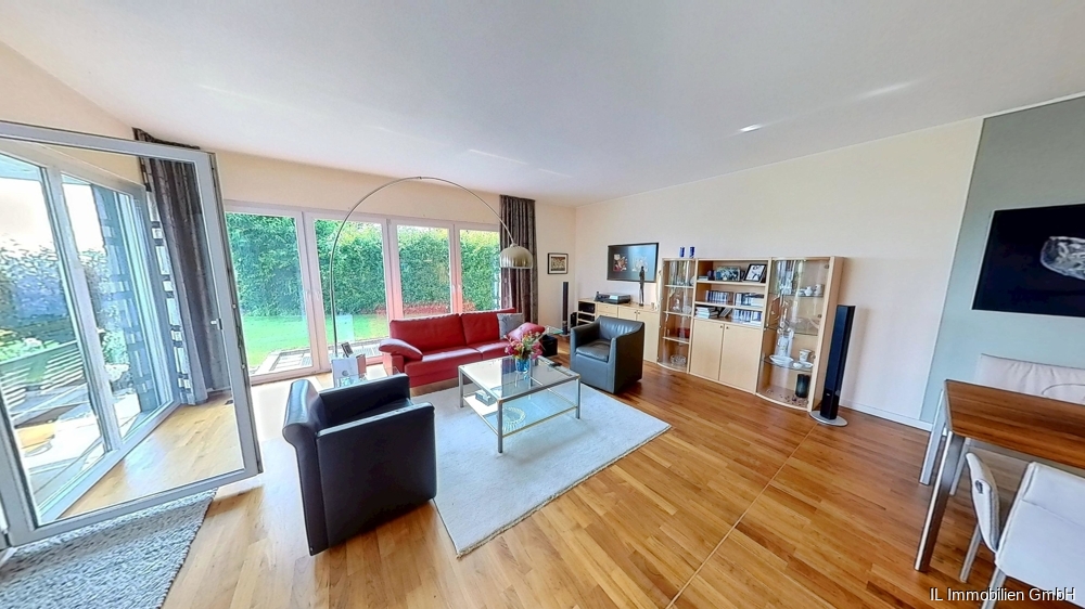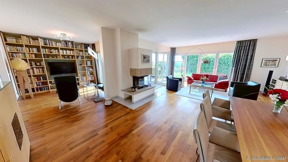 Im Erdgeschoss erwartet Sie ein großzügiges Wohnambiente: das weitläufige Wohnzimmer mit Kamin und angeschlossener Bibliothek lädt zum Verweilen ein und bietet von beiden Bereichen aus direkten Zugang zur einladenden Terrasse aus Granit, die mit einem Glatz-Sonnenschirm und integrierten Lautsprechern ausgestattet ist - ideal für entspannte Stunden im Freien. Die exklusive Küche ist mit erstklassigen Miele-Geräten, darunter ein Dampfgarer und ein Induktionsherd sowie einem AEG-Tiefkühlschrank ausgestattet und stellt auch ambitionierte Kochprofis zufrieden. Das Schlafzimmer bietet neben hohem Komfort auch Anschluss an das zentrale Audiosystem, das zusätzlich in Küche, Bad, Terrasse und Sauna für eine angenehme Klangkulisse sorgt. Das geräumige Badezimmer verfügt über eine große Dusche und eine Whirlpool-Badewanne. Im gesamten Wohnbereich ist hochwertiges Parkett verlegt, während Bäder, Flure und das Treppenhaus mit edlem Granit ausgestattet sind.