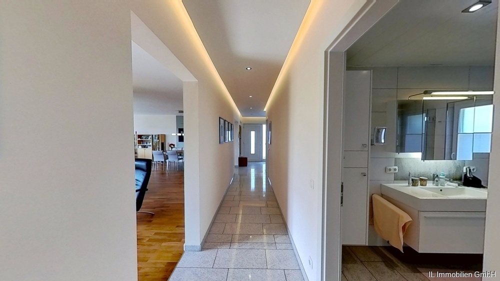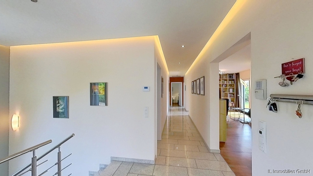 Die Fußbodenheizung, die sowohl im Erd- als auch im Untergeschoss in jedem Raum einzeln über Homatic steuerbar ist, sorgt ganzjährig für angenehme Temperaturen. Die Beheizung erfolgt über eine moderne Wärmepumpe, die zusätzlich eine Kühlfunktion bietet. Die Haustechnik umfasst eine Satelliten-Anlage für 2 Satelliten mit Anschlüssen in mehreren Räumen sowie eine LAN-Verteilung in alle Wohnräume. Die Rollladensteuerung mit Astrofunktion und eine Alarmanlage mit Telefonruf von innen und außen scharf schaltbar sorgen für Sicherheit und Komfort. Im Hausanschlussraum gibt es eine Wasserenthärtungsanlage. Ihre Fahrzeuge stehen geschützt in der gefliesten Doppelgarage und zusätzlich gibt es noch einen Stellplatz.