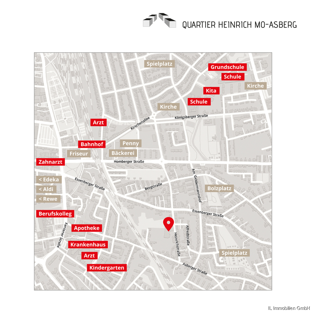Unser Neubauprojekt QUARTIER HEINRICH entsteht in zentraler Lage in Moers-Asberg – unweit der Innenstadt, die mit einem facettenreichen Angebot an Geschäften, Gastronomie und Kultur aufwartet. Die unmittelbare Umgebung bietet alles Nötige für den täglichen Bedarf sowie ein schönes Potpourri an Freizeitaktivitäten.