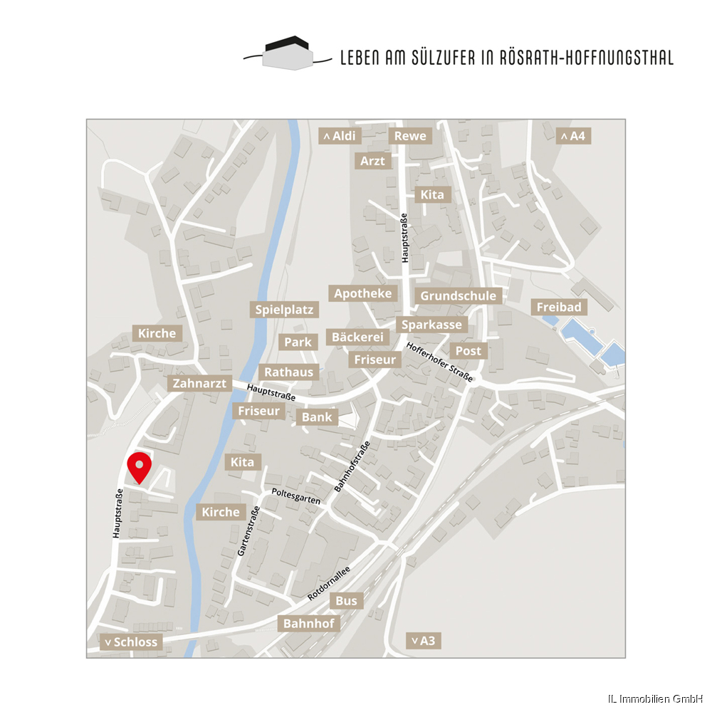 Unser Neubauprojekt LEBEN AM SÜLZUFER befindet sich in exponierter Lage an der Hauptstraße in Rösrath-Hoffnungsthal. Der Ortskern ist fußläufig erreichbar und bietet alles Nötige für den täglichen Bedarf sowie ein schönes Angebot an Gastronomie. Ebenso liegt auch der Bahnhof Rösrath-Hoffnungsthal mit seiner Regionalbahnstation und diversen Buslinien in unmittelbarer Nähe.