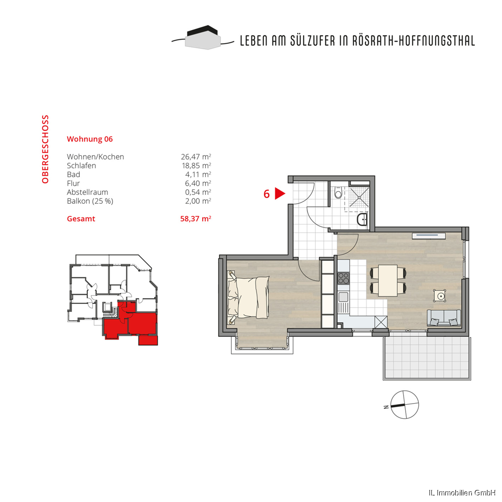 Bei der hier angebotenen Wohnung handelt es sich um die Wohnung Nr. 6 im Obergeschoss ca. 58 m², bestehend aus 2 Zimmern, offen gestalteter Küche, Flur, Bad, Abstellraum und Balkon.