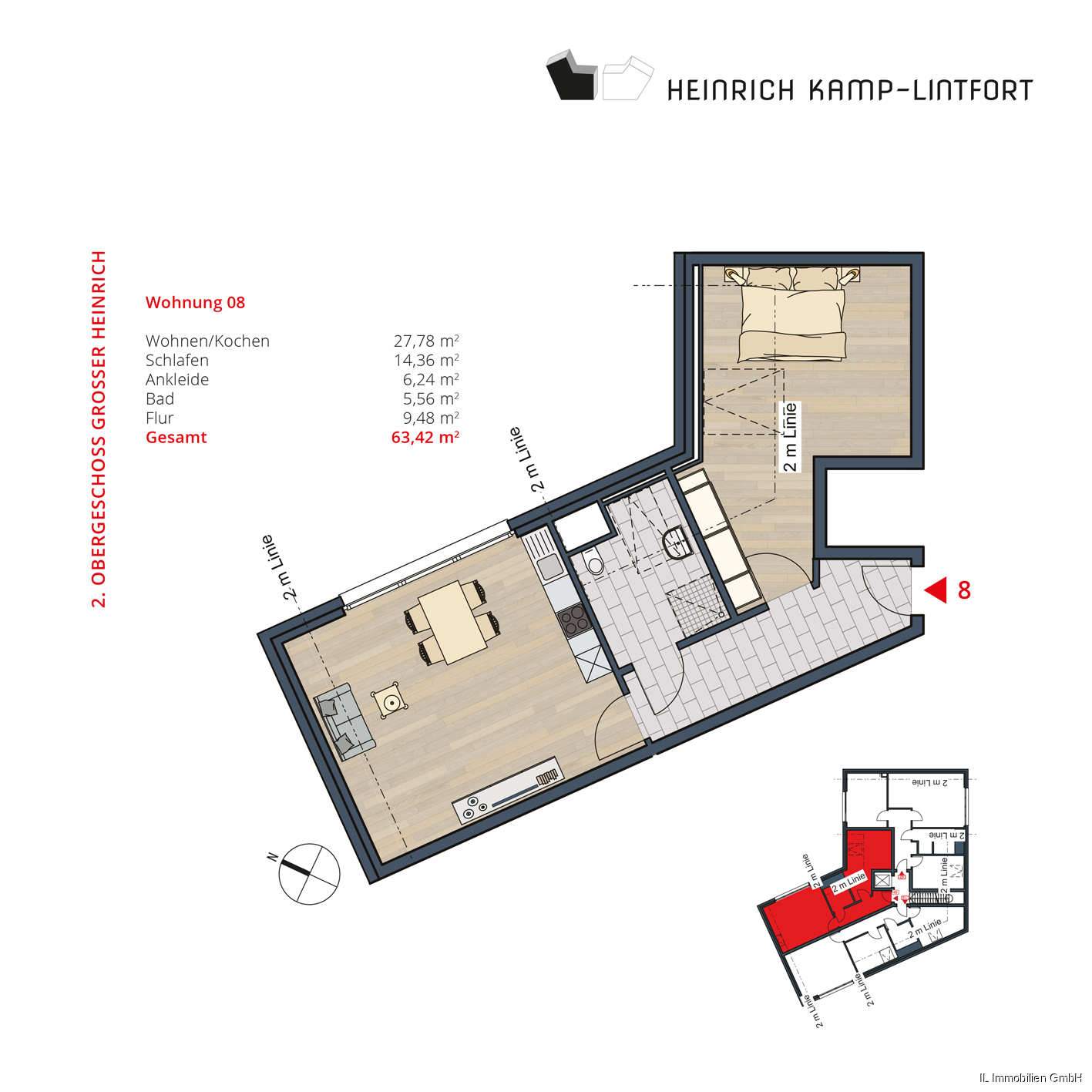 Wir freuen uns über Ihr Interesse an unserer neuwertigen Mietwohnung im Objekt GROSSER HEINRICH in Kamp-Lintfort. Bei der hier angebotenen Wohnung handelt es sich um die Wohnung Nr. 08 im 2. OG mit einer Wohnfläche von ca. 63,42 m², bestehend aus: