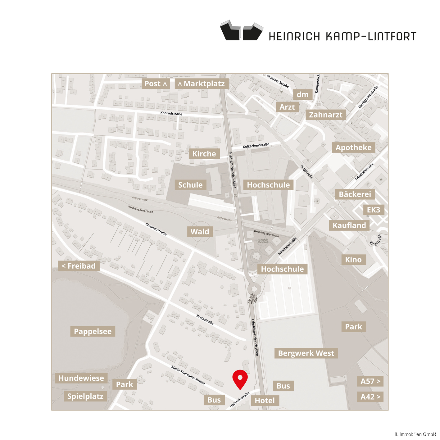 HEINRICH ist ein attraktives und komfortables Neubauprojekt in bester Lage. Unmittelbar am Pappelsee mit seinen umgebenden Park- und Grünflächen gelegen und nur einen Katzensprung entfernt von der Kamp-Lintforter Mitte finden Sie hier ein facettenreiches Angebot. Ob Spielplatz, Hundewiese und Freizeitbad auf der einen Seite oder Shopping, Gastronomie und Kultur auf der anderen Seite – die Vielfalt ist riesig und in nur wenigen Gehminuten erreichbar. Auch die Stadtverwaltung, Banken, Ärzte und Geschäfte des täglichen Bedarfs finden Sie in direkter Nähe.
